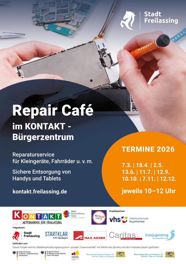 Am Samstag, 7. März 2026, von 10 bis 12 Uhr findet das nächste Repair Café im Kontakt Freilassing statt. Besucherinnen und Besucher können defekte Elektrogeräte, Fahrräder, Textilien, Nähmaschinen sowie Computer, Handys und Drucker mitbringen und gemeinsam mit unseren ehrenamtlichen Helferinnen und Helfern reparieren – alles gegen Spende.