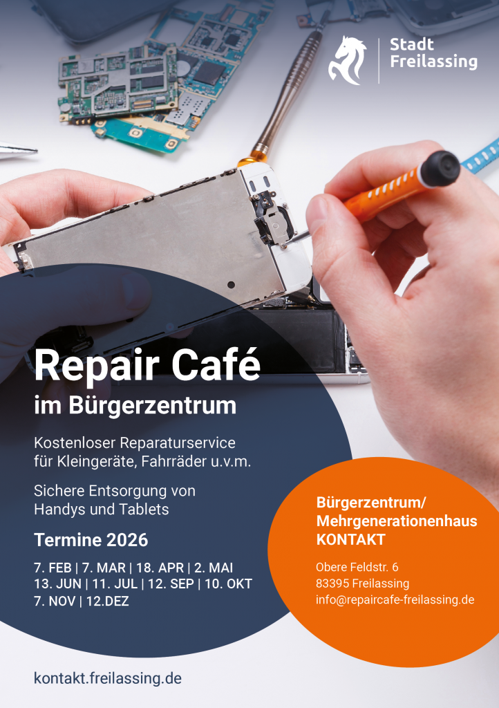 Auskunft kann über info@repaircafe-freilassing.de bei der Leitung Rosalie Gramatikov erfragt werden.